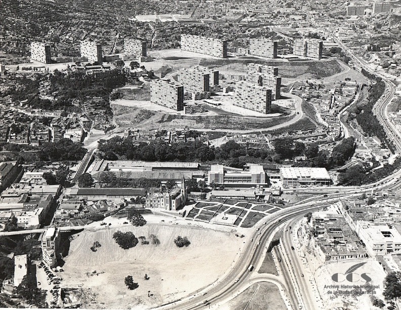 Super Bloques del 23 de Enero (Antigua Urbanización ‘2 de Diciembre’), Caracas, alrededor de 1957: Esta vista aérea captura el momento de expansión urbana de Caracas y la culminación de un megaproyecto de vivienda social que buscaba erradicar los ‘ranchos’ de los cerros.