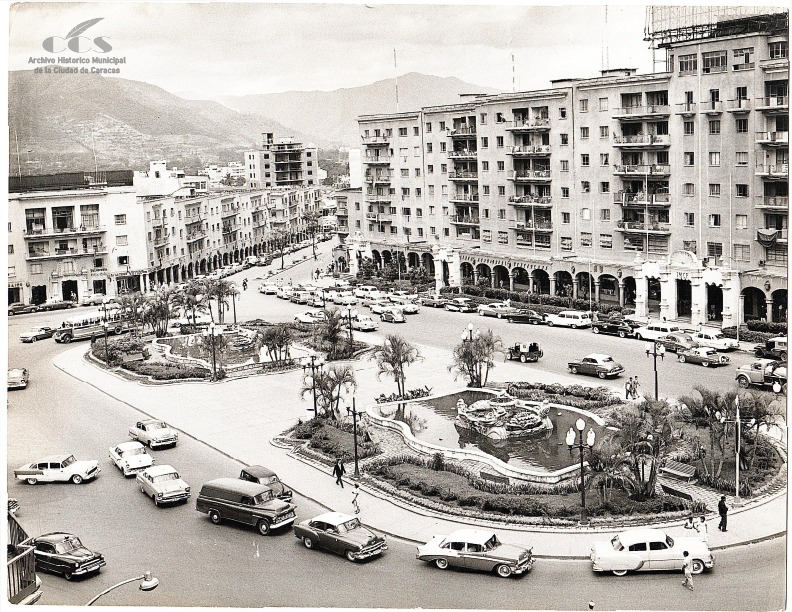 Plaza O’Leary, Caracas, alrededor de 1950-1960: Un vistazo al corazón urbano de la ciudad en plena efervescencia. La fuente central y la cuidada jardinería son testigos silenciosos del paso de los primeros vehículos de la época, mientras los edificios circundantes revelan la arquitectura característica de una Caracas en constante crecimiento. Una postal en blanco y negro que captura la esencia de una época dorada de la capital.»